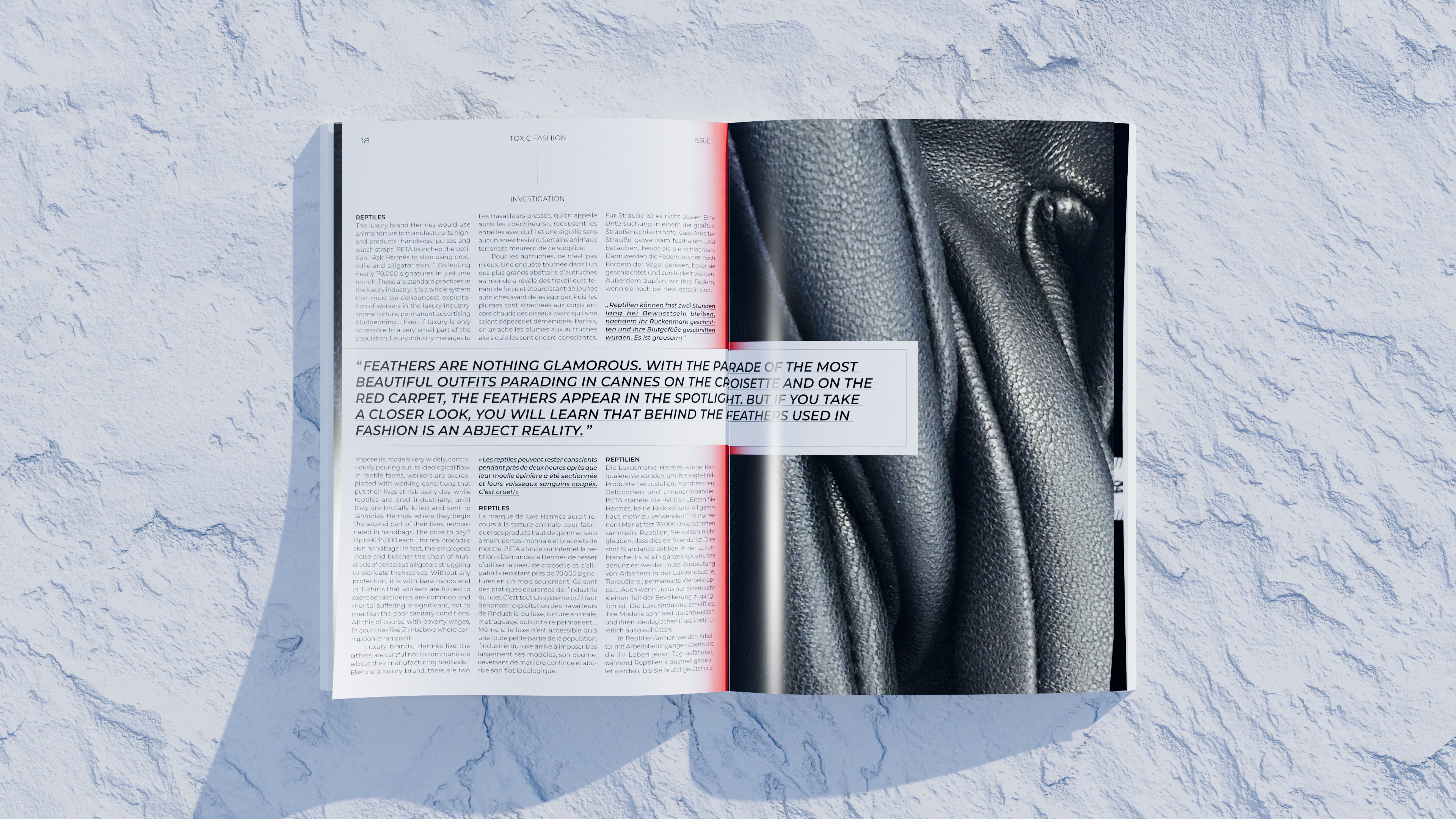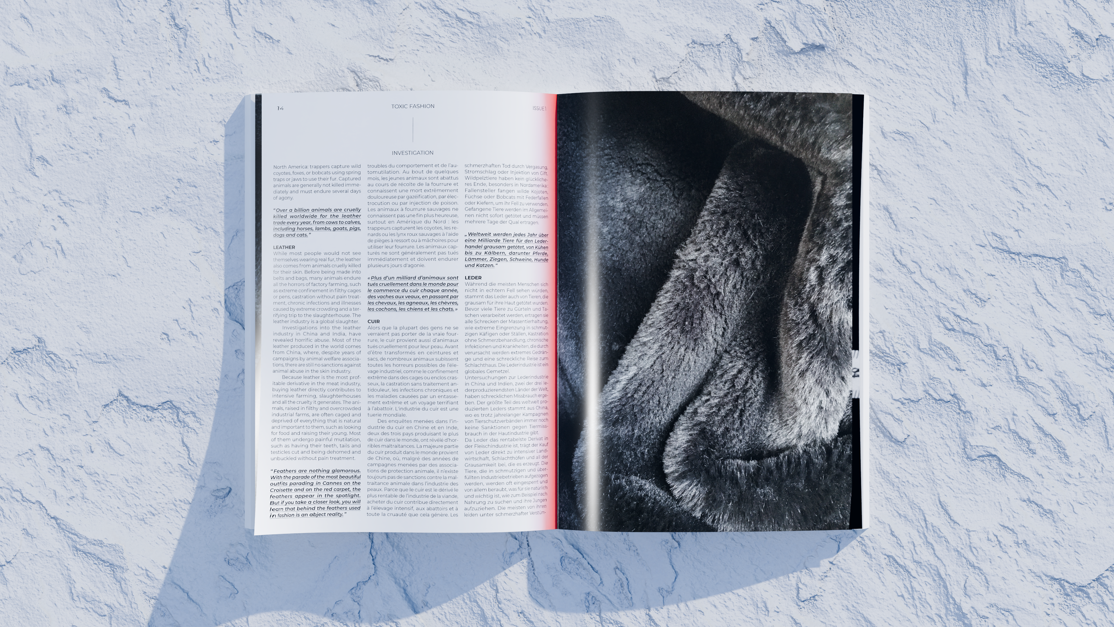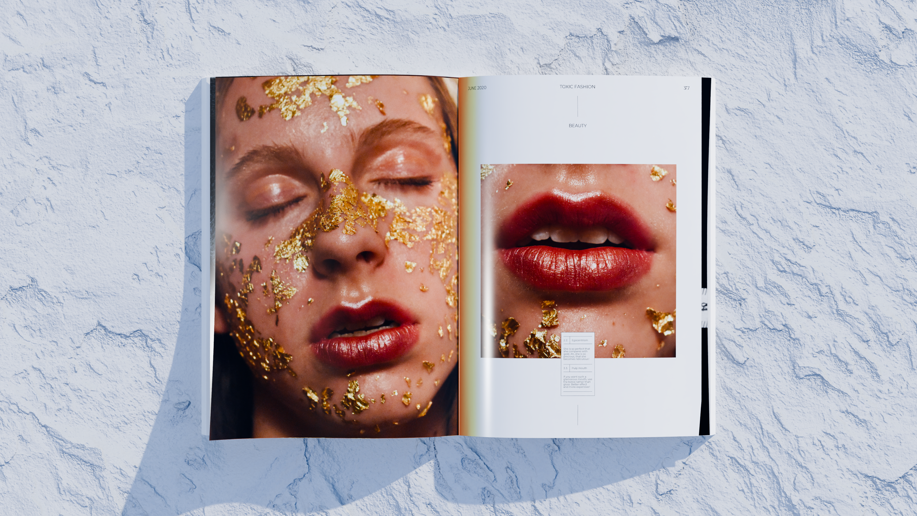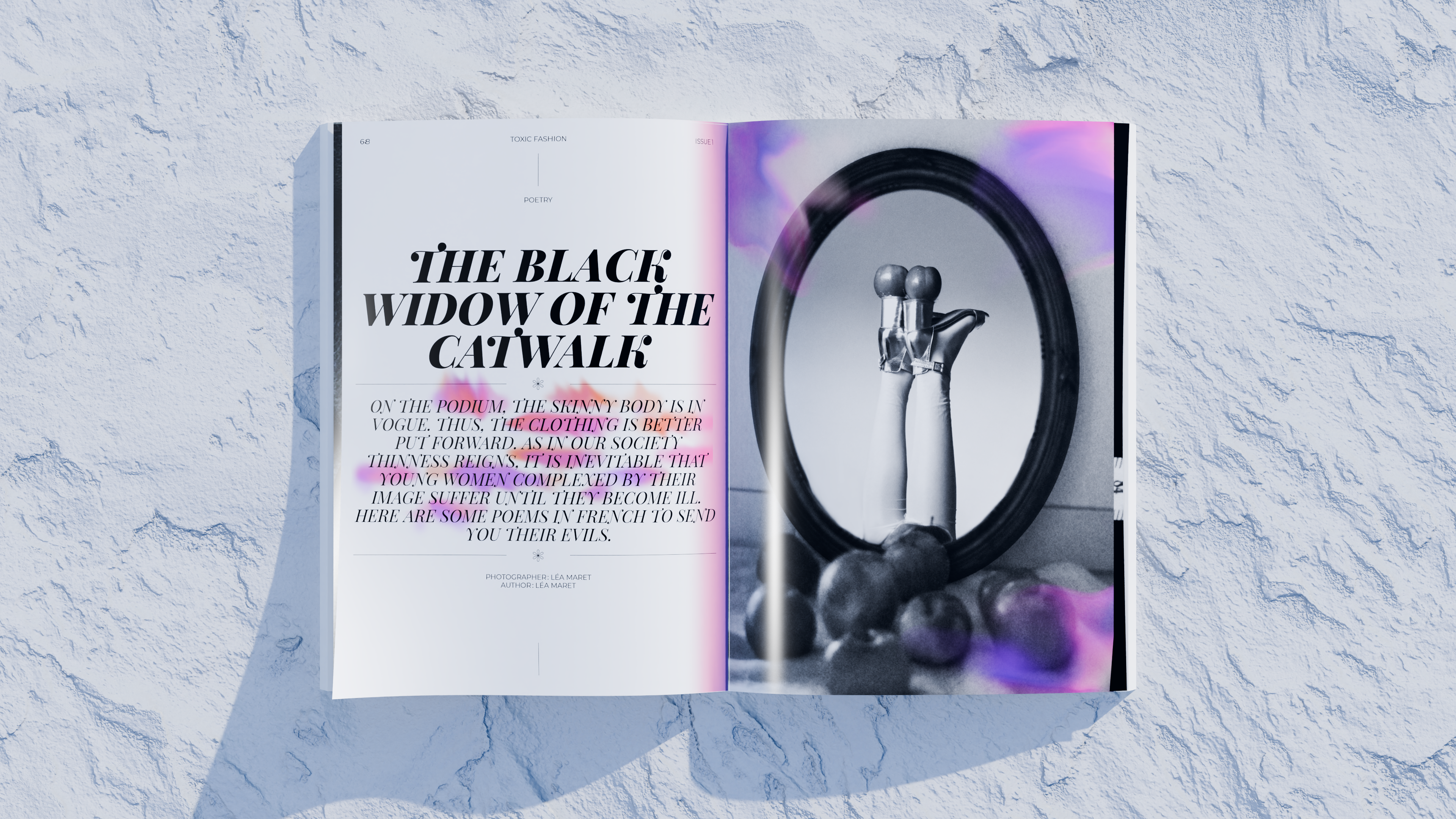 Toxic fashion est un magazine de mode paradoxal et ironique montrant l’envers du décor de cette industrie irréaliste et capricieuse. Il traite de sujets tels que l’anorexie, l’exploitation animale, la drogue, l’ego et les réseaux sociaux.